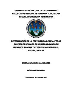 Rosales Ramos, Cristian Javier (2015) Determinación de la prevalencia de nematodos gastrointestinales en 15 hatos bovinos de miembros AGAPAM. octubre 2014-enero 2015, Moyuta, Jutiapa. Other thesis, Universidad de San Carlos de Guatemala.