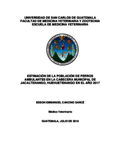Cancino Sancé, Edson Emmanuel (2018) Estimación de la población de perros ambulantes en la cabecera municipal de Jacaltenango, Huehuetenango en el año 2017. Other thesis, Universidad de San Carlos de Guatemala.